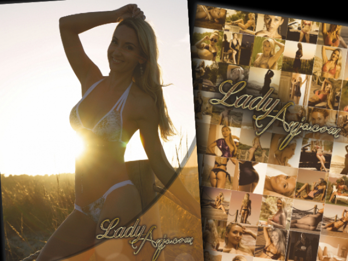 Handsignierte Autogrammkarte Motiv "Wetlook-Outfit auf einem Sandweg" (Vorderseite und Rückseite bedruckt)