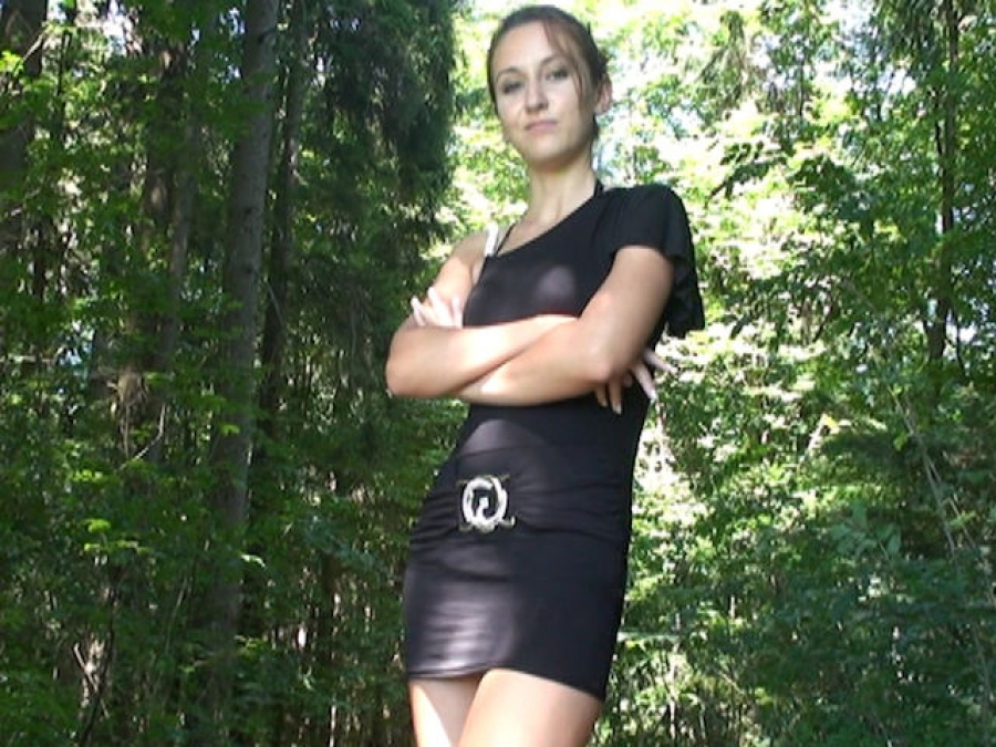 Denn sieh doch einmal, was der dumme Waldboden mit meinen schönen Schuhen macht! Bei jedem Schritt sinken die Absätze meiner HighHeels in den Boden und werden ganz schön dreckig. Dagegen wirst du jetzt sofort etwas unternehmen! Du rutschst mir auf deinen Knien am Waldboden hinterher und wirst meine Absätze sauber lecken! Aber bitte wie ein wirklicher Hund, der du bist. Kopf auf die Erde und den Waschlappen, den du Zunge nennst, herausgeholt und die Absätze richtig schön sauber machen. Nur mit der Zunge. Nach einem langen Spaziergang habe ich einfach keine Lust, dir den Absatz in dein dummes Hundemaul zu stopfen.